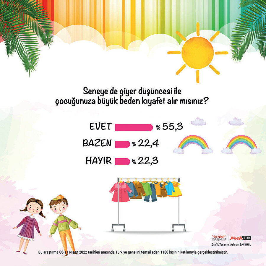 Areda Piar, benim markam mayıs ayı araştırmasında çocuk giyim markalarını ele aldı. Araştırma sonuçlarına göre, ebeveynlerin çocuklarına en çok satın aldığı ürün yüzde 83,8 ile t-shirt olurken, seneye de giyer düşüncesi ile çocuğuna büyük beden kıyafet satın alanların oranı yüzde 55,3.