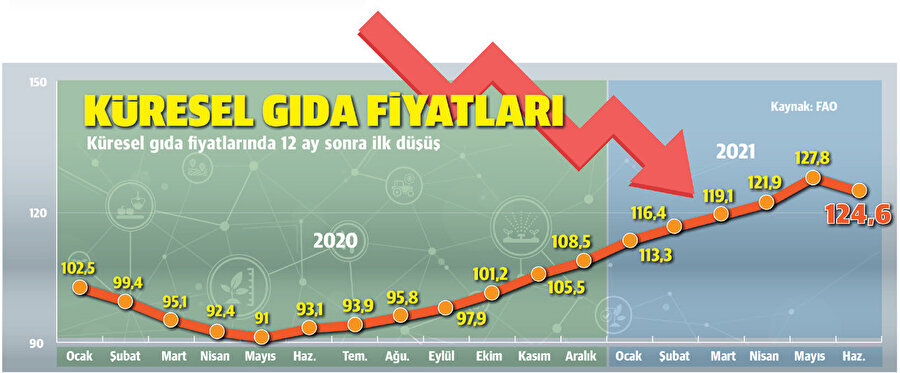 Küresel bazda enflasyonu yükselten en önemli unsurlardan biri de küresel gıda fiyatlarındaki artış. Birleşmiş Milletler Gıda ve Tarım Örgütü’nün (FAO) verilerine göre küresel gıda fiyatlarındaki artış yüzde 33,9 oldu. Ancak küresel yükseliş Haziran ayında aylık bazda soluklandı. FAO’nun Gıda Fiyat Endeksi Haziran ayında 12 aylık aralıksız yükselişinin ardından ilk kez geriledi. Mayıs ayında 127,8 değerini alan endeks, Haziran ayında 124,6 seviyesine geriledi. Endeks bir önceki aya göre yüzde 2,5 seviyesinde gerilerken, geçen yılın aynı ayına göre endeks hala yüzde 33,9 daha yüksek seviyede. Gıda fiyatlarını yukarı taşıyan en önemli unsurlar, dünya genelinde yaşanan kuraklık ve tedarikte yaşanan aksaklıklar, Çin’den gelen yoğun talebin karşılanamaması. Örneğin 2021’in ilk çeyreğinde bitkisel yağ fiyatları bir önceki yılın aynı dönemine göre ortalama yüzde 52,6 artarak gıda fiyatlarındaki artışın da ana belirleyicisi oldu.