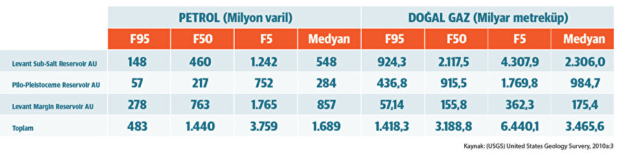 - Amerikan Jeoloji Derneği’nin tahminlerine göre Doğu Akdeniz Havzası’nda yaklaşık 3,5 trilyon metreküp doğalgaz ve 1,7 milyar varil petrol rezervi var. Ancak Akdeniz’deki Münhasır Ekonomik Bölge’ler (MEB) belirlenmediği için bazı sahalardaki rezervlerin kime ait olacağına ilişkin ciddi tartışmaların olacağı aşikar.