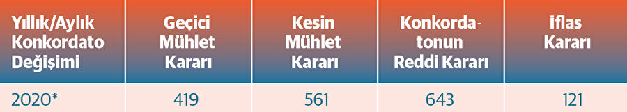 Tablo ve rakamlarda ekonomi yönetimince alınan önlemler sonrası önemli bir düşüş beklenirken bu defa 2020 yılında tüm dünyada etkisini hissettiren COVID-19 pandemisinin başlamasıyla 2019 yılına göre gerilese de yine de önemli sayıda konkordato talebi başvurusu yapılmış olup 2019’da alınan geçici mühletlilerle beraber önemli sayıda talebe red kararı verilmiş ve konkordato kurumunun kötüye kullanılmasına izin verilmemiştir.