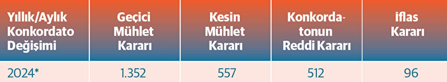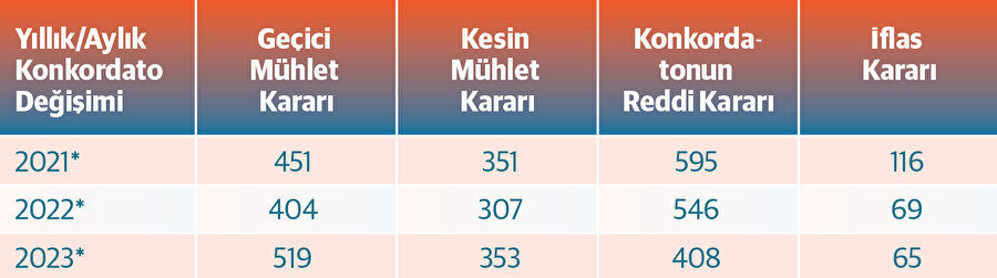 Pandeminin devam ettiği ve kurlardaki ciddi artışlara rağmen 2021 yılındaki rakamlarla beraber yüksek enflasyonun yaşandığı 2022 ve 2023 yıllarında rakamlar görece aynı çerçevede kalmış, her ne kadar eleştirilse de kur korumalı mevduat uygulamasıyla atıl döviz kaynaklarının ekonomiye entegrasyonu sayesinde finansal kaynaklara ulaşımda zorluk çekmeyen iş dünyası bu kritik yılları konkordatoya ihtiyaç derecesi açısından belli bir ortalamayla atlatmışlardır. Yüksek faiz ve parasal sıkılaşma sürecinin devam ettiği son 16 aylık süreçteyse yeniden yükselen konkordato taleplerine yönelik olarak Asliye Ticaret Mahkemlerinde bu alanda yetkin görevlilerin sayısının artırılmasının yanında edinilen 6 yıllık tecrübenin de katkısıyla çok daha ince elenip sık dokunan bir iş planının oluşturulması sayesinde kabu-red rakamlarında önemli değişiklikler göze çarpmakta olup 2023 yılındaki geçici mühletlilerin de sarktığı ve son aylarını yaşadığımız 2024 yılında geçici mühlet sayısı önceki 3 yılın ortalamasına göre %195 artış göstermesine rağmen kesin mühlet sayısındaki artış oranı %65 civarında kalmış gözükmektedir.