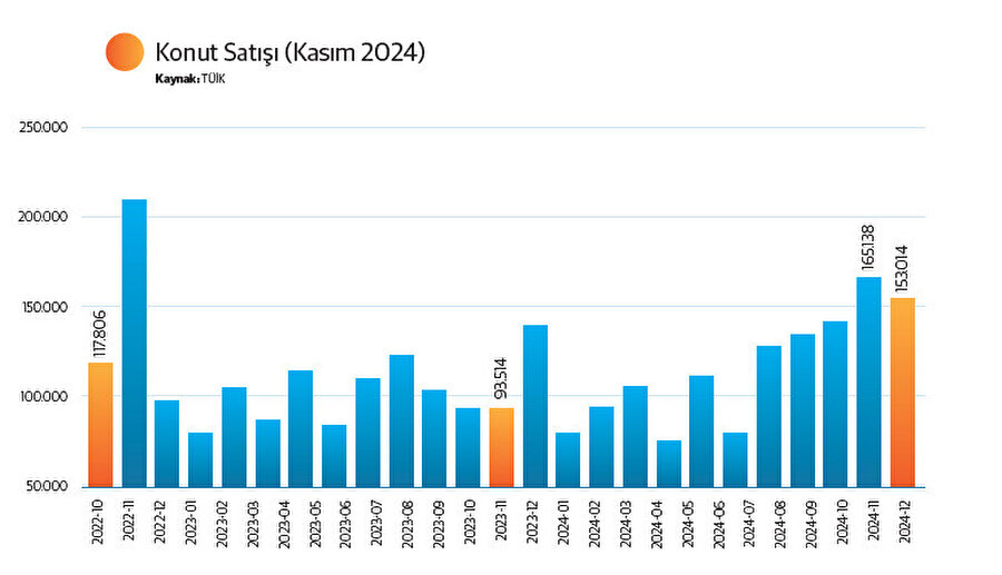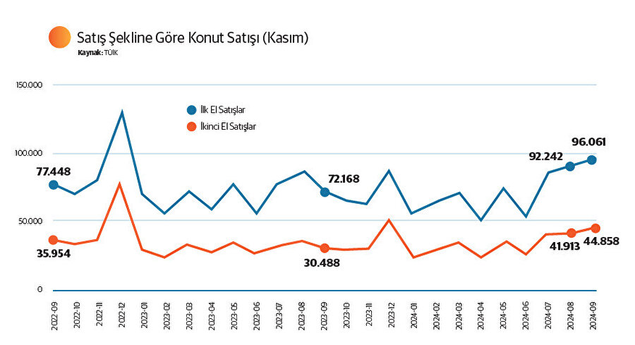 Üçüncü çeyrekteki inşaat harcamalarının ise geçen yılın aynı dönemine göre yüzde 63,3 artarak 1,72 trilyon TL’ye yükseldiği görülüyor. Bu yüksek büyümede ise enflasyon ve inşaat maliyetlerindeki artışın önemli bir rol oynadığı düşünülüyor. Kasım ayındaki konut satış sayısı ise bir önceki yılın aynı ayına göre yüzde 63,6 artarak 153 bin 14 olurken, Ocak-Kasım döneminde ise bir önceki yılın aynı dönemine göre %16,4 oranında artarak 1 milyon 265 bin 388’e yükseldi.