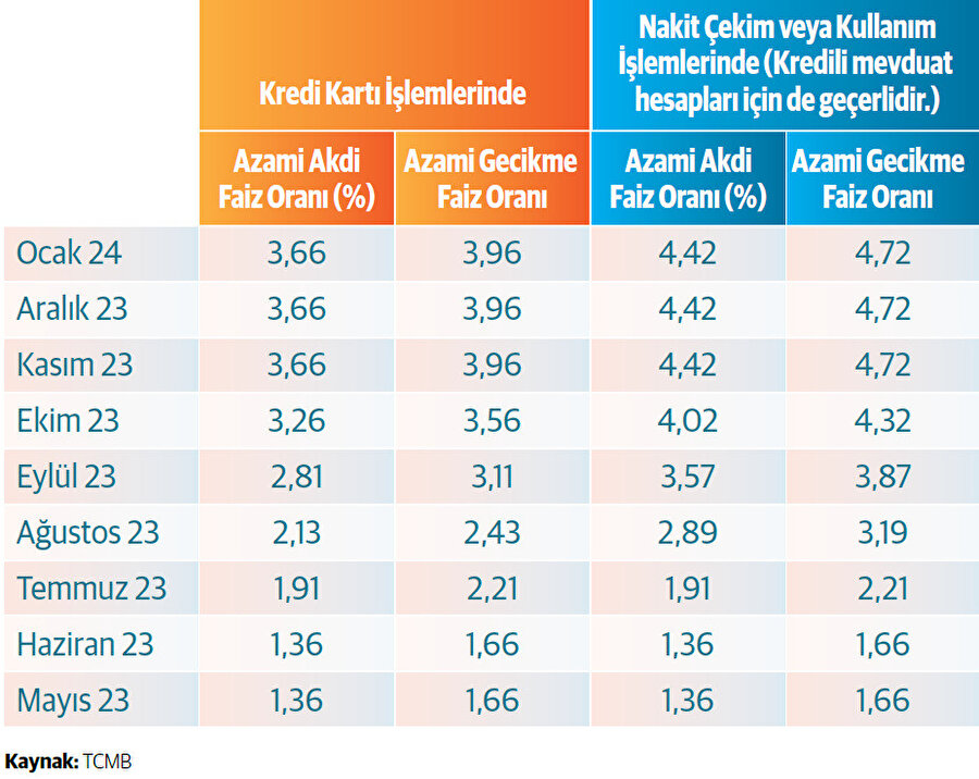 Kredi kartı harcama işlemlerinde azami akdi faiz oranı yüzde 3.66’ya, azami gecikme faiz oranı yüzde 3.96’ya yükselirken, nakit çekim işlemleri ve kredili mevduat hesaplarındaki azami akdi faiz oranı yüzde 4.42’ye, azami gecikme faiz oranı ise yüzde 4.72’ye ulaştı.