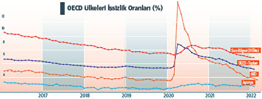 OECD’nin son raporu bölge ülkelerde istihdam tarafındaki olumlu gelişmelere dikkat çekiyor. OECD bölgesindeki işsizlik oranı 2022 Ocak ayında yüzde 5,3 iken Şubat’ta yüzde 5,2’ye geriledi. Bu veri birçok yönüyle önemli. Şubatta kaydedilen oran işsizlik oranının ilk kez pandemi öncesi oranın altına düştüğünü gösteriyor. Aynı zamanda bu oran 2001’den bu yana en düşük oranı ifade ediyor. Önümüzdeki aylarda işsizlik oranının düşmesi bekleniyor. Verilere Ukrayna-Rusya arasındaki savaşın etkileri henüz yansımış değil. Başta otomotiv olmak üzere birçok sektörde tedarik sorunları devam ediyor. Mevcut gelişmeler tabloyu ihtiyatlı okumayı gerektiriyor. Ancak aynı zamanda ticari ortak olan Euro bölgesi ülkeleri, ABD ve Japonya’da işsizliğin aynı hızla geriliyor olması umut verici.