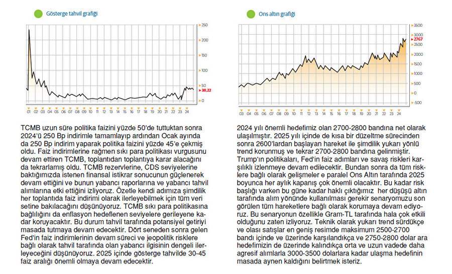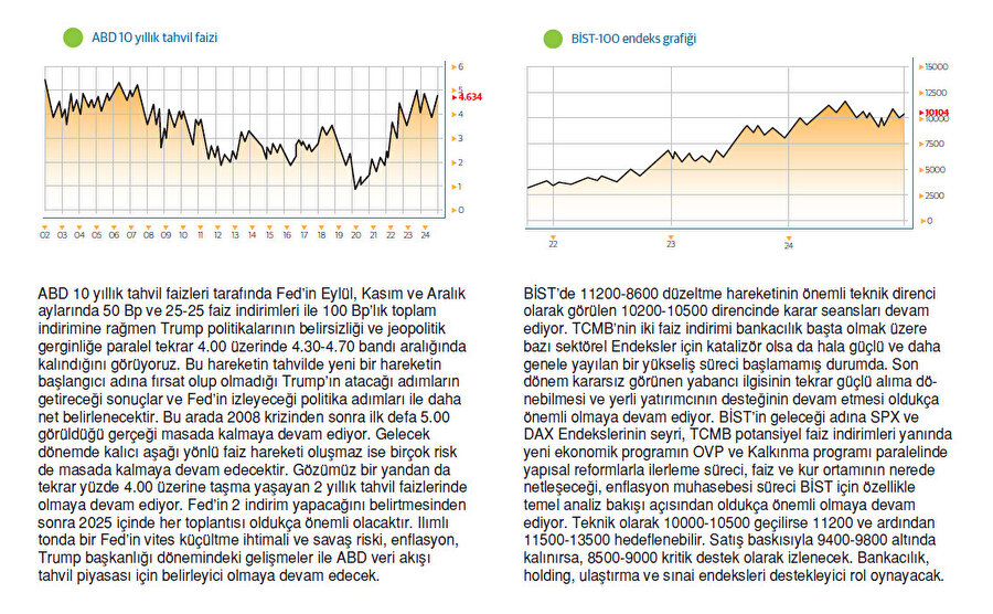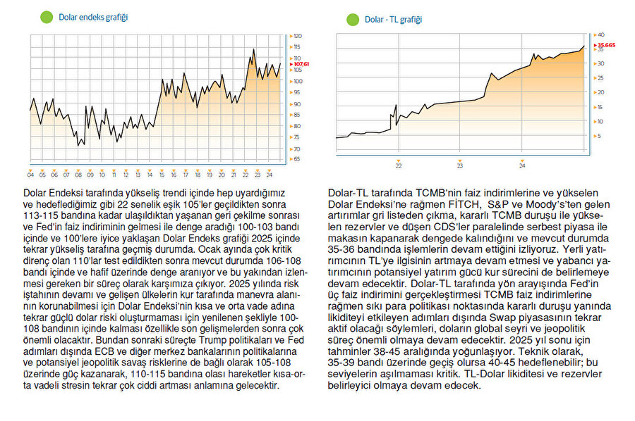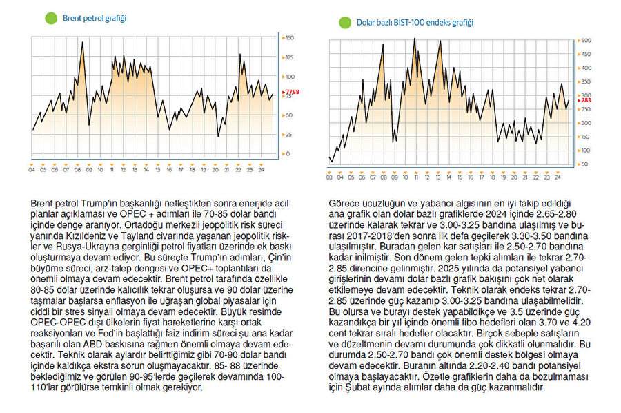 Majör fiyatlamalara baktığımızda ABD 10 yıllıklar 4.80’lere yaklaştıktan ve yüzde 5.00 alarmı verdikten sonra şimdilik 4.50’lerde denge arıyor. Dolar Endeksi uyardığımız gibi 110’lara ulaştıktan sonra şimdilik 107- 108 aralığında beklemeye geçmiş durumda. Brent petrol Trump baskısı ile kritik eşik 80 doları şimdilik geçemezken, altın tekrar 2700-2800 direnç eşiğine gelerek trendini korumaya ve bizi haklı çıkarmaya devam ediyor. Takip ettiğimiz tüm önemli fiyatlar haber akışlarına bağlı olarak her iki yönde farklı değişimler gösterecektir.
