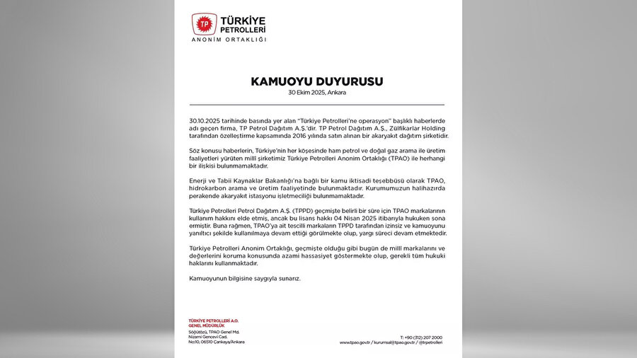 TPAO'nun sosyal medya hesabından yapılan açıklamada, "30 Ekim 2025 tarihinde basında yer alan 'Türkiye Petrolleri’ne operasyon' başlıklı haberlerde adı geçen firma, TP Petrol Dağıtım A.Ş.'dir. TP Petrol Dağıtım A.Ş., Zülfikarlar Holding tarafından özelleştirme kapsamında 2016 yılında satın alınan bir akaryakıt dağıtım şirketidir. Söz konusu haberlerin, Türkiye’nin her köşesinde ham petrol ve doğal gaz arama ile üretim faaliyetleri yürüten milli şirketimiz TPAO ile herhangi bir ilişkisi bulunmamaktadır" denildi.