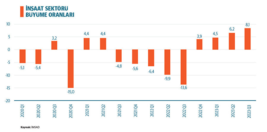 İnşaat sektöründe 2023 yılı, yerli ve yabancı yatırımcıların ev almayı durduğu bir yıl olmasına rağmen büyüme son çeyrekte de devam etti. Türkiye İnşaat Malzemesi Sanayicileri Derneği (Türkiye İMSAD) verilerine göre inşaat malzemesi sanayi üretimi 2023 Eylül ayında bir önceki yılın aynı dönemine oranla yüzde 5,4 oranında yükselirken, inşaat harcamaları 2023 yılı üçüncü çeyreğinde yüzde 107,3 artarak 1 trilyon TL oldu. İnşaat sektörü güven endeksi ise seçimlerin yapıldığı mayıs ayından itibaren gerileme eğilimine girdikten sonra ilk kez kasım ayında artış gösterdi. Endeks 2023 Kasım ayında bir önceki aya göre 1,3 puan arttı. Tüm veriler ışığında 2023’ün yüzde 6’lık bir büyüme ile kapatılması beklenirken bu büyümeye sebep olarak ise seçim sonrası belirsizliklerin azalması ve deprem bölgesi inşaat faaliyetlerinin sektörü olumlu desteklemesi gösterildi.