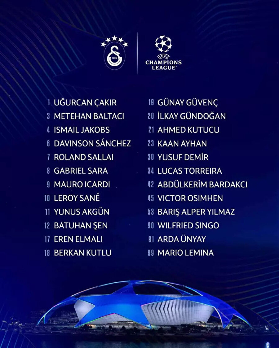 Galatasaray, 25-26 sezonunda Şampiyonlar Ligi'nde mücadele edecek. Sarı kırmızılı takım, Şampiyonlar Ligi için UEFA'ya bildirilen kadrosunu açıkladı.