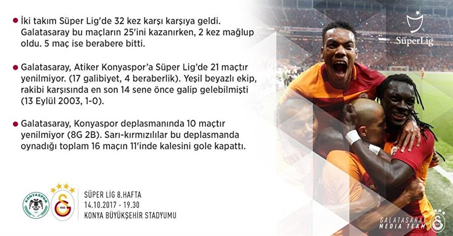 32 maçta Galatasaray 66 gol atarken, Konyaspor ise 18 gol attı. Geçen sezonki iki maçı da Galatasaray içerde 2-1 ve deplasmanda 0-1’lik skorlarla kazandı.