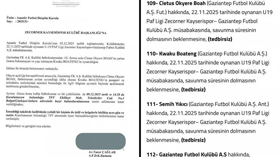 Amatör Futbol Disiplin Kurulu’nun 2 Aralık 2025 tarihli toplantısında, 22 Kasım 2025’te oynanan U19 PAF Ligi Kayserispor - Gaziantep FK maçına ilişkin iddiaları değerlendirmeye alındı. Karara göre Gaziantep FK oyuncularından Cletus Okyere Boah’ın yerine yaşı tutmayan Kwaku Boateng’in oynatıldığı iddiası üzerine kulüplerden detaylı bilgi istenildi ve konu araştırılmaya başlandı.