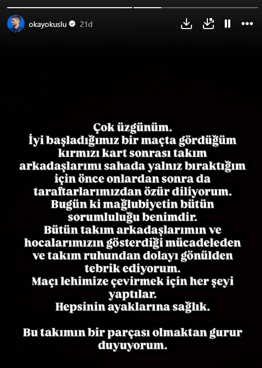 Yokuşlu, paylaşımında, "İyi başladığımız bir maçta gördüğüm kırmızı kart sonrası takım arkadaşlarımı sahada yalnız bıraktığım için önce onlardan, sonra da taraftarlarımızdan özür diliyorum. Bugünkü mağlubiyetin tüm sorumluluğu benimdir" ifadelerini kullandı.