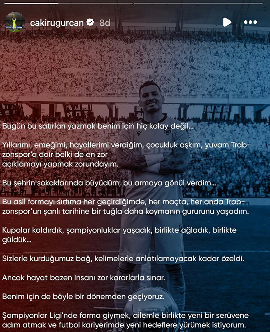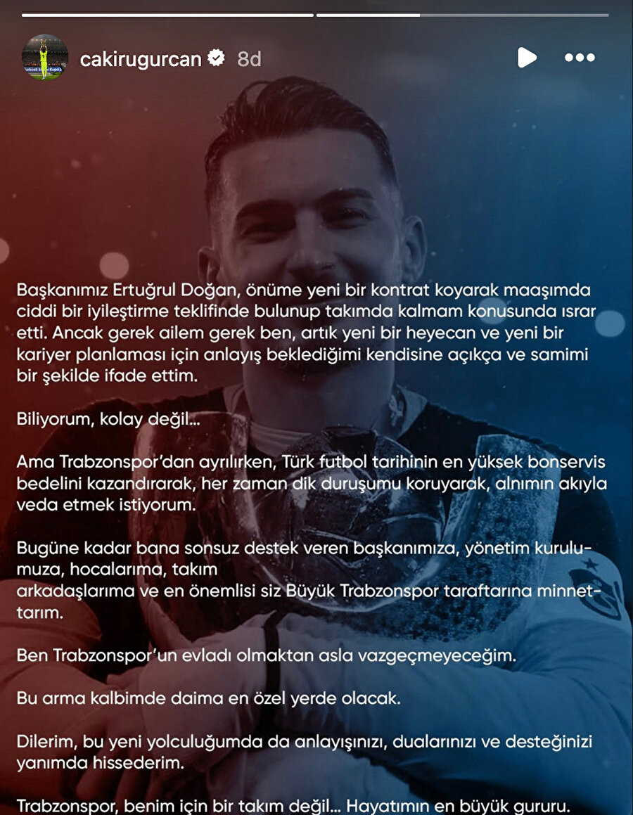 Paylaşımında Trabzonspor camiasına teşekkür eden milli kaleci, “Başkanımıza, yönetim kurulumuza, hocalarıma, takım arkadaşlarıma ve en önemlisi Büyük Trabzonspor taraftarına minnettarım. Ben Trabzonspor’un evladı olmaktan asla vazgeçmeyeceğim. Bu arma kalbimde daima özel bir yerde olacak” diye konuştu. Trabzonspor benim için bir takım değil, hayatımın en büyük gururu. Dilerim bu yeni yolculuğumda da anlayışınızı, dualarınızı ve desteğinizi yanımda hissederim” ifadelerine yer verdi.