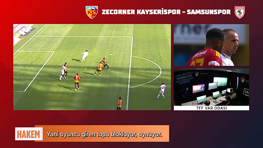 Kayserispor - Samsunspor müsabasının 9. dakikasında gelişen konuk ekip atağı sonrası top dışarı çıktığında hakem Ümit Öztürk, VAR’dan ‘potansiyel penaltı için sahada inceleme’ önerisi aldı. Konuşmalar şu şekilde: